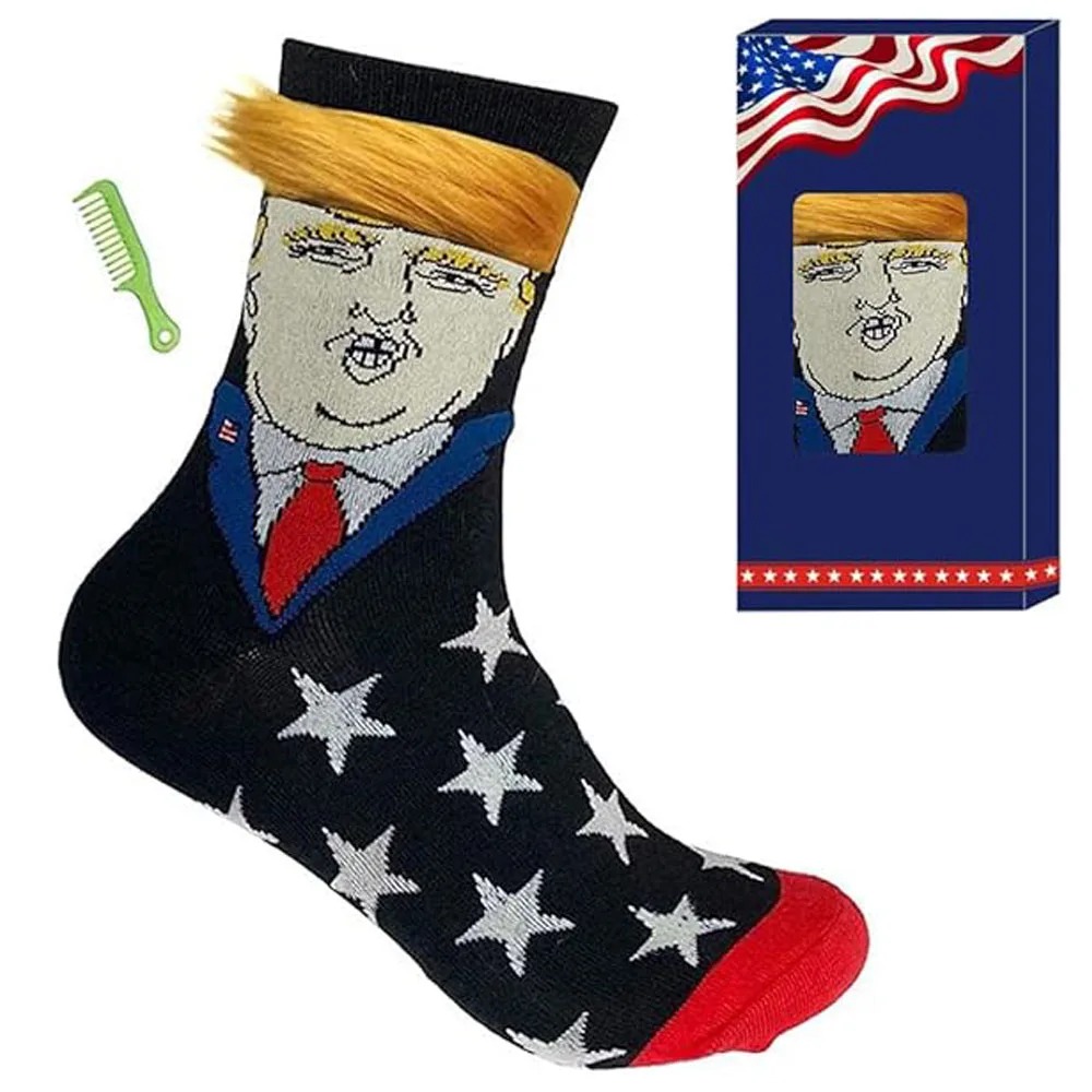 🧦Hilarious Design: The gag gift presidential socks feature a cartoon design of Donald Trumpy's face with exaggerated feature and yellow hair and comes with a small comb so you can dress up Trumpy. Donald Trumpy cotton socks can be matched with a variety of outfits with simple color and versatile style. Definitely a blowout patriotic gift.